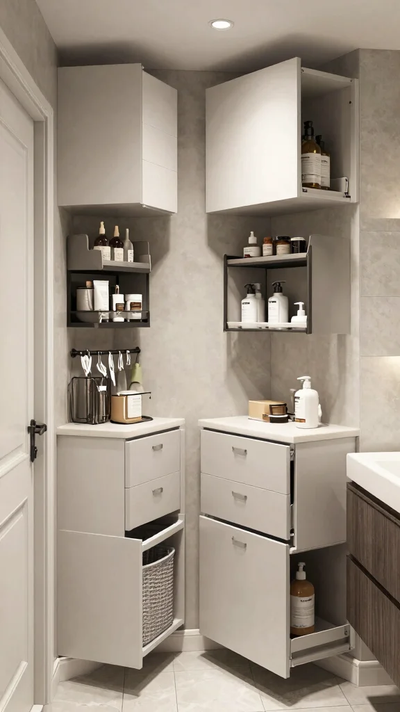 Incorporate cabinets with built-in organizers, such as pull-out drawers for toiletries or compartments for cleaning supplies, to maximize efficiency.