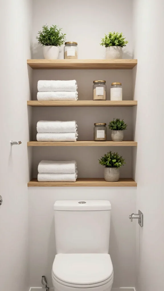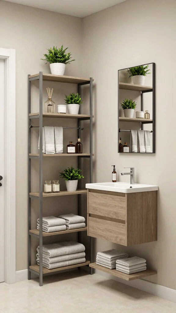 Instead of bulky cabinets, sleek shelves can showcase your favorite towels, decorative items, or plants, keeping everything within reach.