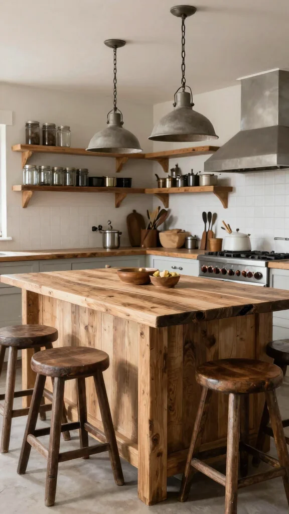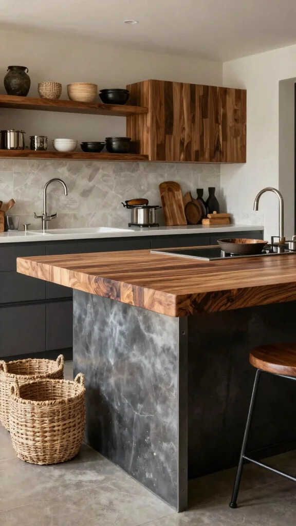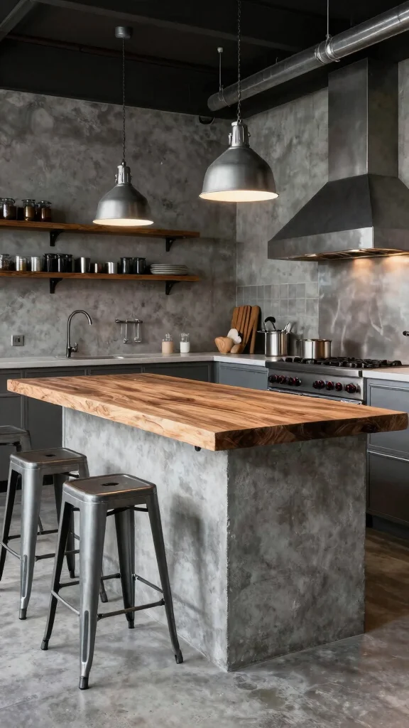 For fans of the industrial aesthetic, complementing your butcher block kitchen island with metal and concrete accents creates an urban and stylish vibe. This combination balances the warmth of wood with the sleekness of metal and concrete, resulting in a trendy, functional space.