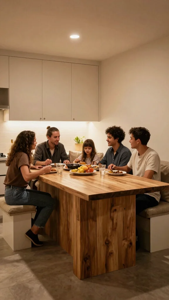 – Incorporating built-in benches or cushioned seats around the island.