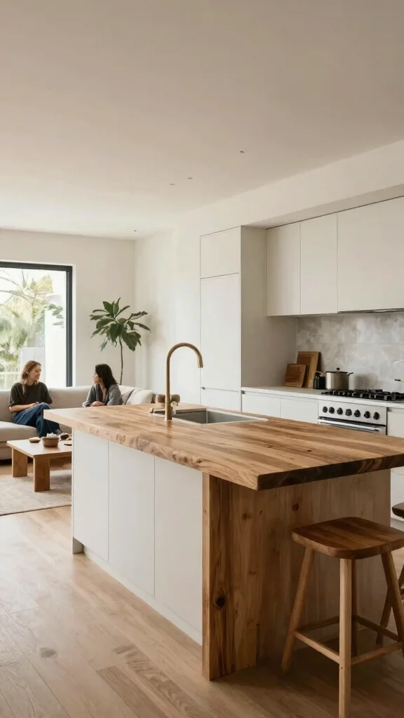 – Using similar materials throughout the kitchen and living space to create unity.