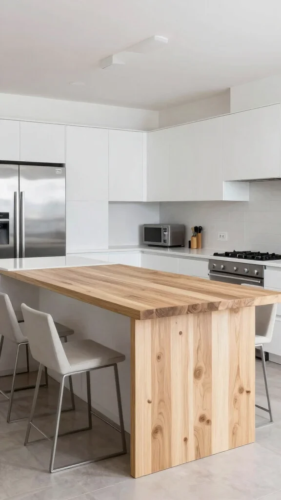 If a modern aesthetic speaks to you, a butcher block kitchen island with sleek lines and simplicity is an ideal choice. A light wood finish complements bright white cabinetry and stainless steel appliances, crafting a tidy and airy atmosphere. This minimalist design ethos fosters a sense of spaciousness, perfect for those who crave uncluttered elegance.
