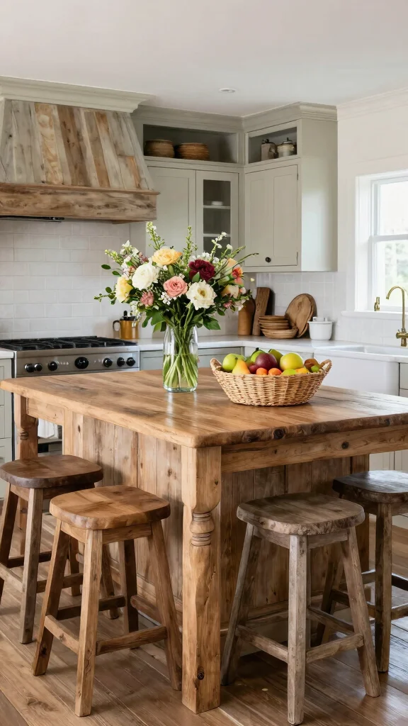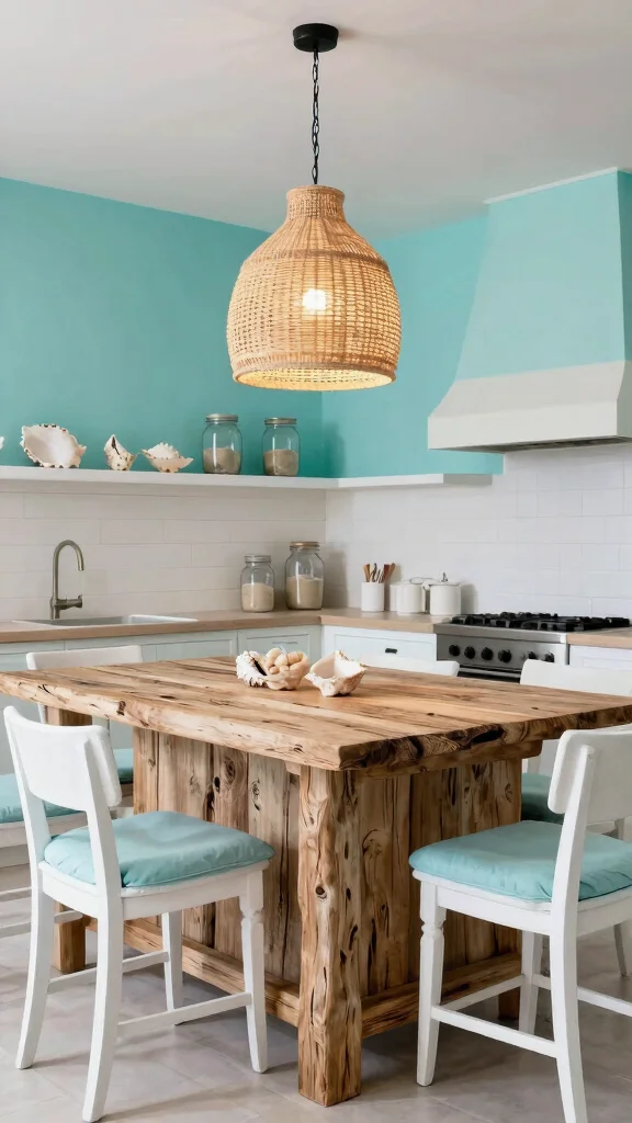 A farmhouse-style kitchen island adds a rustic, cozy feel that pairs beautifully with coastal elements. Utilize a large farmhouse table with distressed edges as your island, and surround it with comfortable, oversized bar stools for ample seating. This design fosters a warm and inviting atmosphere, perfect for family gatherings. Decorate with fresh flowers or a woven basket of fruits to keep the island lively and cheerful.