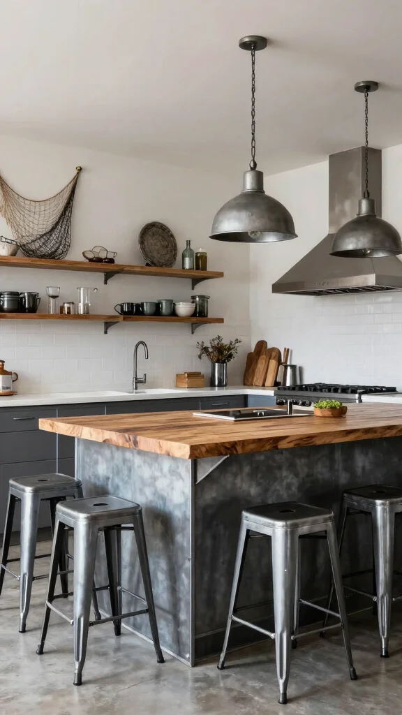 Integrating industrial elements into your coastal kitchen creates a beautiful contrast that feels modern and inviting. Imagine an island with a sturdy metal base paired with a reclaimed wood top, combining strength and warmth for a busy kitchen. Utilize metal stools or industrial lighting fixtures to reinforce this theme while incorporating nautical accessories for a softer touch.