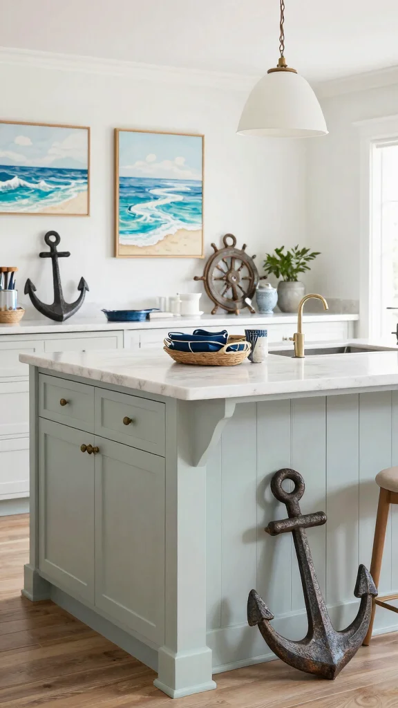 Finally, the right themed accessories can beautifully tie your coastal kitchen island together. Nautical-themed decor items, like vintage anchors, ship wheels, or ocean-inspired artwork, elevate your kitchen’s overall appeal. Strategically placing these accents around your island creates a cohesive look that embodies the seaside spirit. Opt for subtly textured items that maintain a light and breezy feel, enhancing the coastal atmosphere.