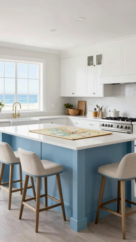 Insights: Incorporating a few well-chosen themed pieces can transform your kitchen island from ordinary to extraordinary, fully immersing it in a coastal lifestyle.
