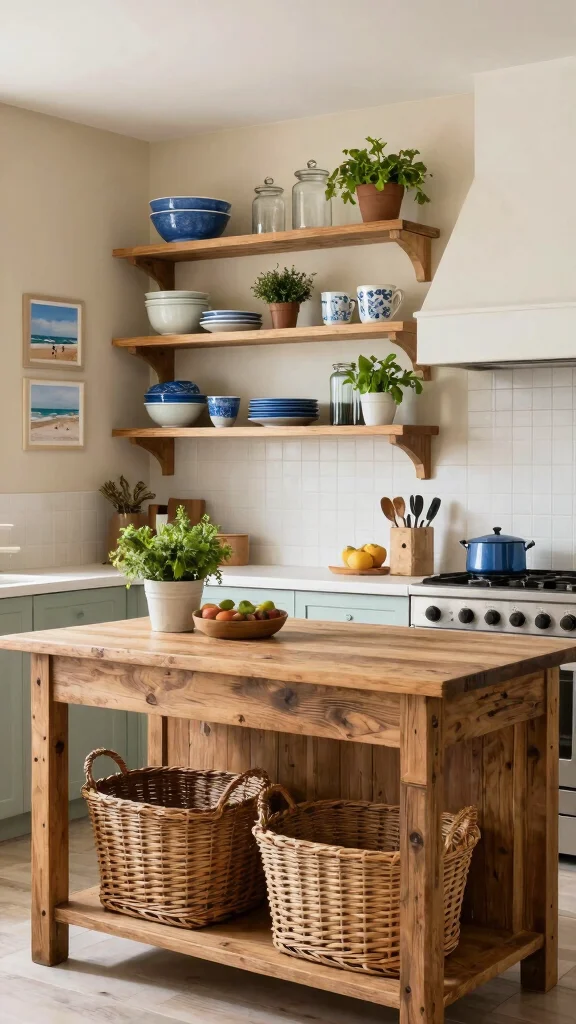 What are practical storage ideas for a rustic coastal kitchen island?