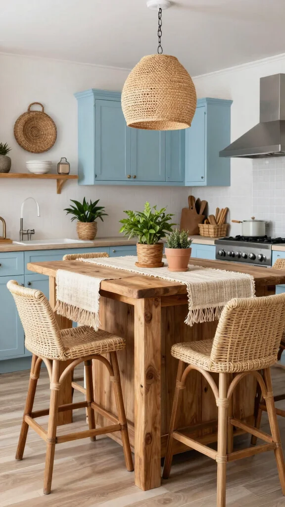 Integrating woven textures into your coastal kitchen island adds warmth and depth to the design. Utilize materials like rattan or wicker for bar stools or decorative elements to create a layered appearance. Consider a woven table runner or placemats made from natural fibers to soften surfaces, evoking a relaxed beach atmosphere. These textures resonate with the coastal environment, enhancing the cozy vibe of your kitchen.