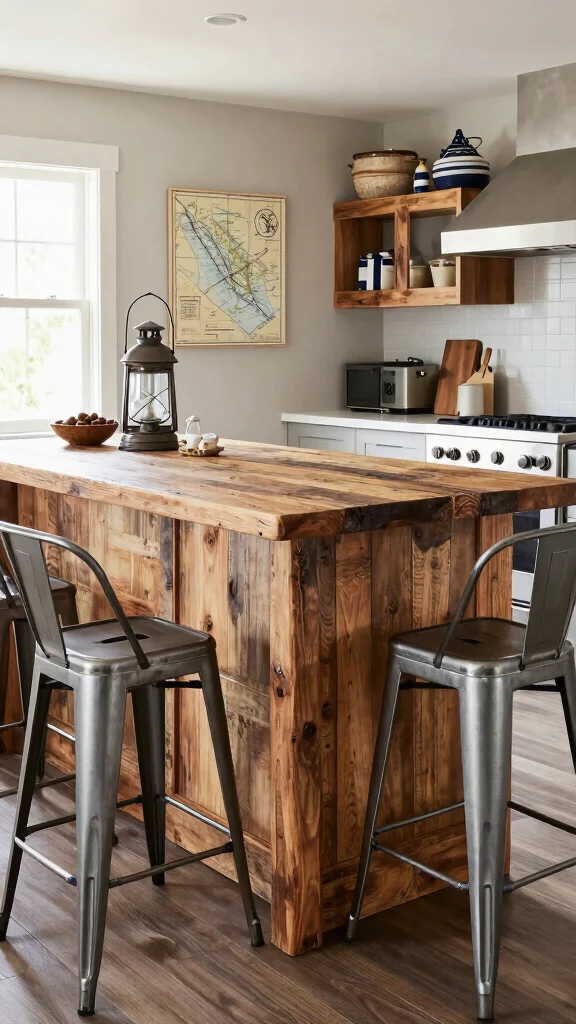 Which nautical kitchen accessories work best with a rustic coastal kitchen island?