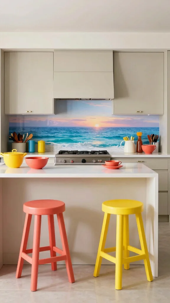Embrace bold, colorful accents in your coastal kitchen island for a lively atmosphere. Bright yellows, oranges, and coral can inject a fun and cheerful vibe into the space. Accent your island with vibrant bar stools or decorative kitchenware inspired by the hues of a sunset over the ocean. Balancing these bold colors with a neutral base ensures the space remains inviting rather than overwhelming.