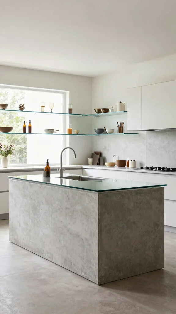 The blend of concrete and glass can create a stunning modern aesthetic in your kitchen. Imagine a concrete island topped with a sleek glass countertop, offering a unique twist on traditional surfaces. This pairing allows you to enjoy the robustness of concrete while benefiting from the elegance and transparency of glass.