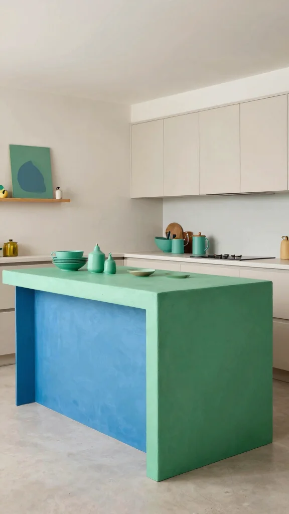 Opting for colorful concrete can elevate your kitchen island from ordinary to extraordinary. Rather than sticking with plain gray, consider using dyed concrete in vibrant hues to infuse personality and flair into your space. These pops of color can harmonize with your kitchen’s overall theme, creating a fun contrast with other materials.