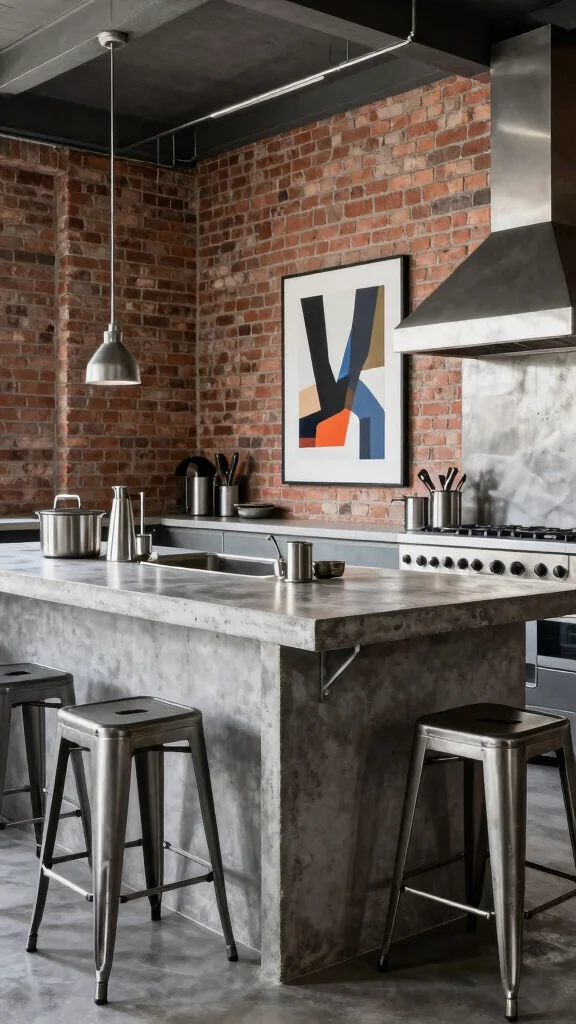 Embracing the raw essence of industrial design, a concrete island with exposed steel accents can create a bold statement in your kitchen. This edgy look pairs perfectly with industrial-style bar stools and metallic kitchen accessories, resulting in a cohesive aesthetic that feels modern and stylish. Imagine a built-in wine rack or open shelving beneath the island to enhance functionality while keeping the design streamlined.