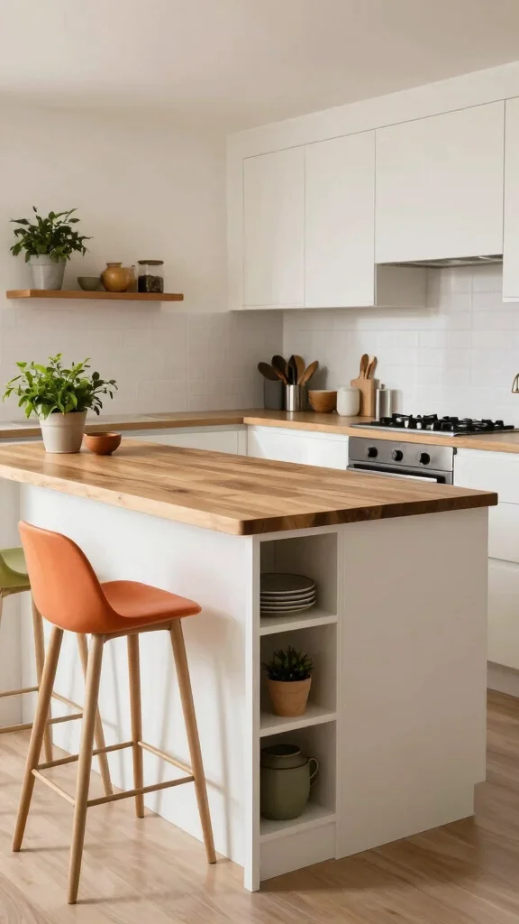 5) A mobile or floating island on lockable wheels for flexible layouts, perfect for small kitchens that occasionally need extra space.