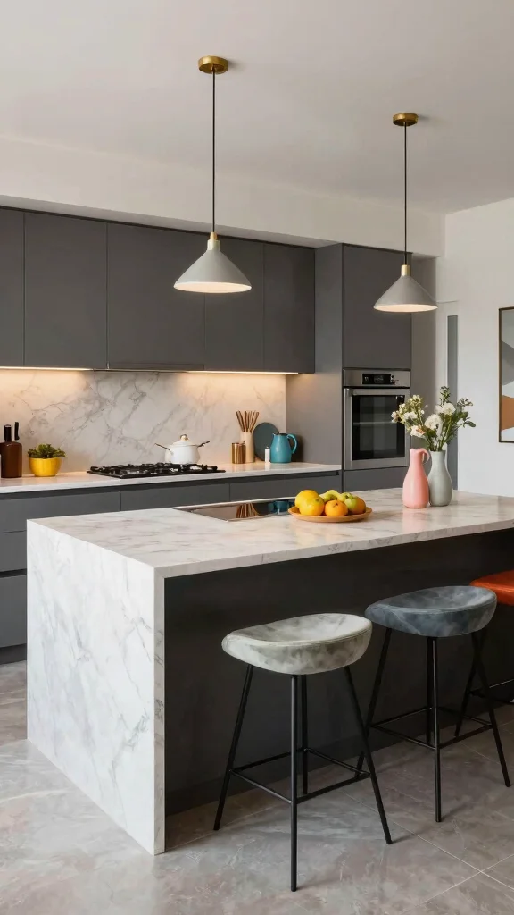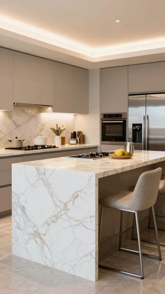 To complement the marble, consider pairing it with warm wood finishes to create balance. Pendant lighting can highlight the beauty of the marble surface, enhancing its elegance.