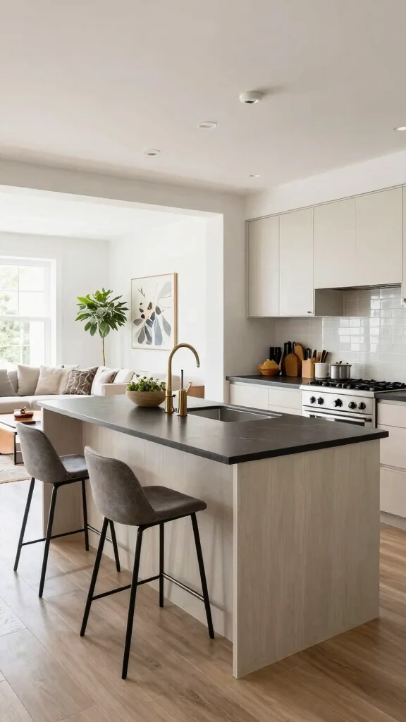 In an open concept kitchen design, your island should act as a visual bridge, not a barrier. Choose same or complementary materials as the rest of the cabinetry to create a seamless flow and a calm color palette for modern kitchen decor. Extend the island length to anchor the space and use a seating side that doubles as a room divider. Layer lighting with pendant fixtures over the island and soft under-cabinet lighting elsewhere to define zones without walls. Keep clutter to a minimum and integrate power outlets so the island remains clear and highly functional within functional kitchen layouts.