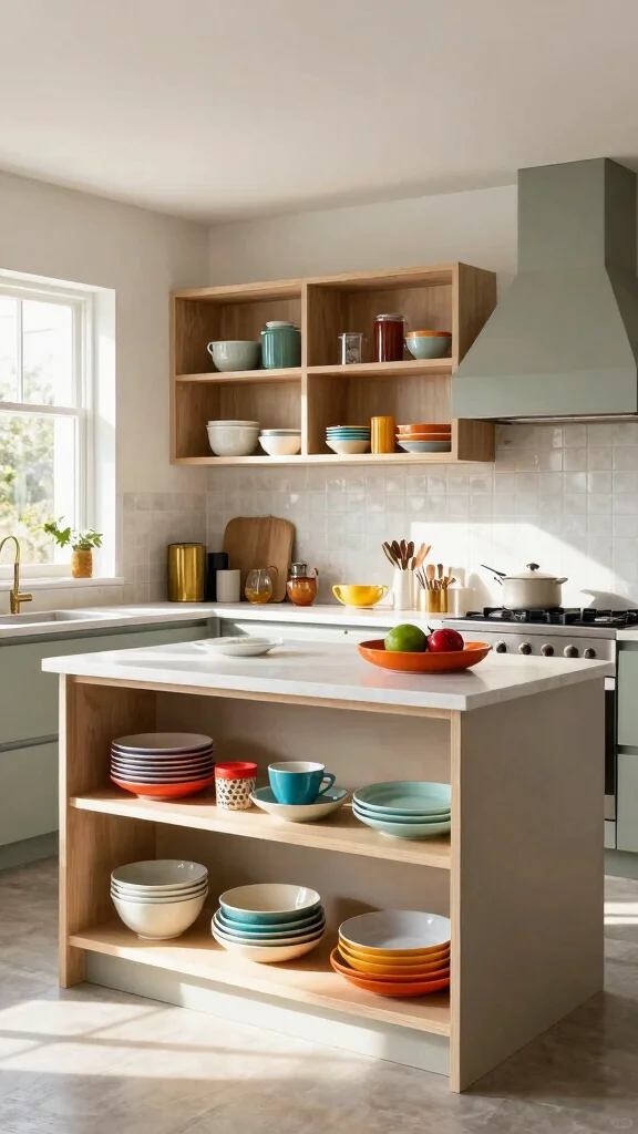Open shelving on your kitchen island brings a contemporary touch while providing easy access to everyday items. This design emphasizes simplicity and style, making it perfect for showcasing beautiful dishware or your favorite cookbooks. It enhances the kitchen’s airiness and charm.