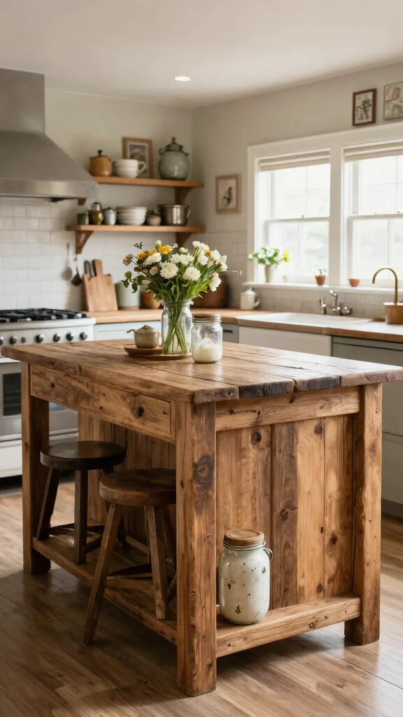 If you’re drawn to a cozy ambiance, a rustic farmhouse kitchen island is perfect for you. This design features natural wood finishes and distressed textures, creating a warm, inviting feel that encourages family gatherings. It blends beautifully with both vintage and modern decor elements.