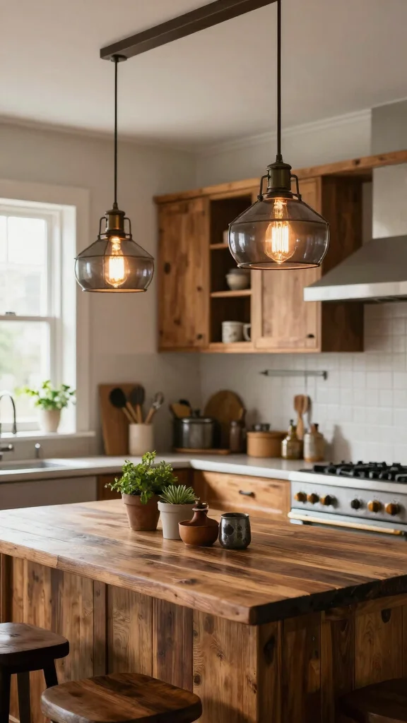 Consider retrofitting or shopping for affordable kitchen pendant lights in rustic styles, and don’t shy away from salvaged or budget-friendly fixtures that can be updated with warm bulbs.