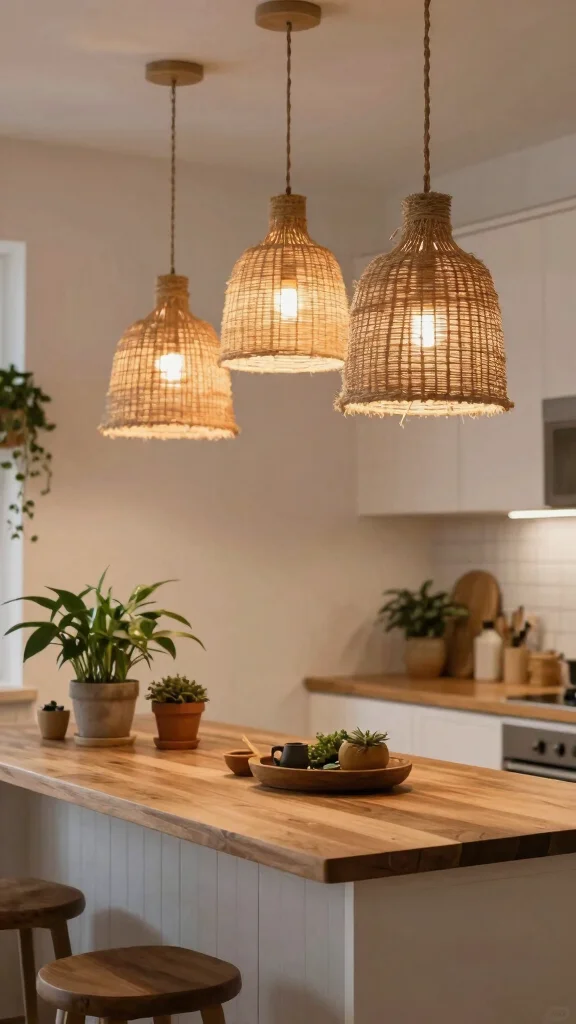 Natural fiber pendant lights enhance your kitchen’s earthy vibe, making it feel grounded and inviting.