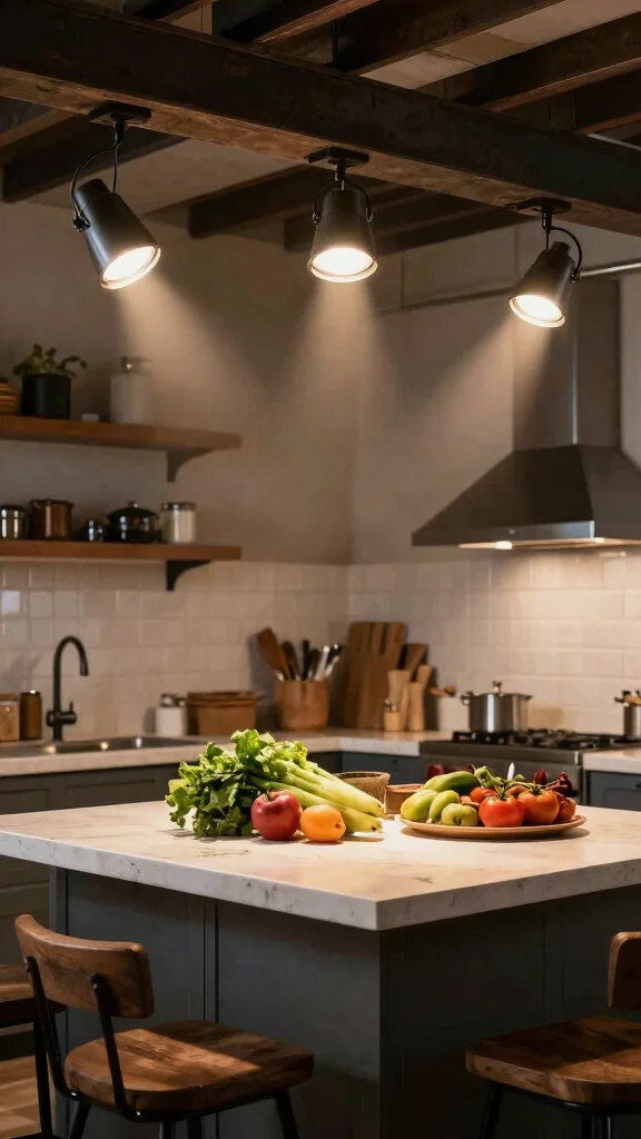 Rustic spotlights enhance your kitchen’s aesthetics while providing practical illumination.