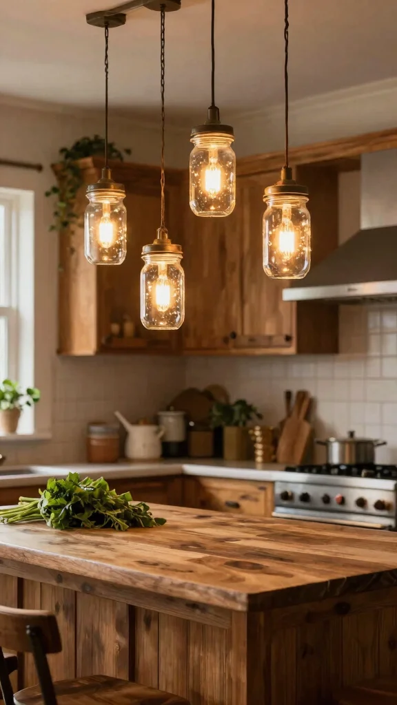 Add a whimsical, DIY touch to your kitchen island with hanging mason jar lights. These charming fixtures can transform ordinary jars into unique light sources that reflect farmhouse aesthetics while providing ample illumination. Customizing jars with different bulbs or decorative elements inside adds your personal flair.