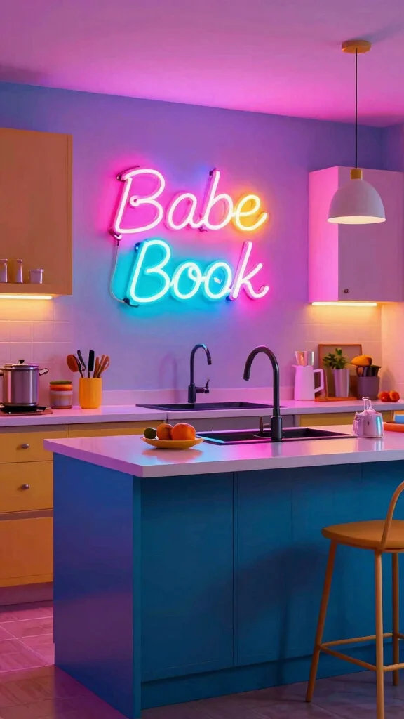 Incorporate colorful neon lighting to give your kitchen island a bold, modern twist. Neon lights can create fun shapes or phrases that inject personality into your space. These fixtures not only illuminate but also serve as statement pieces that make your kitchen vibrant and lively.