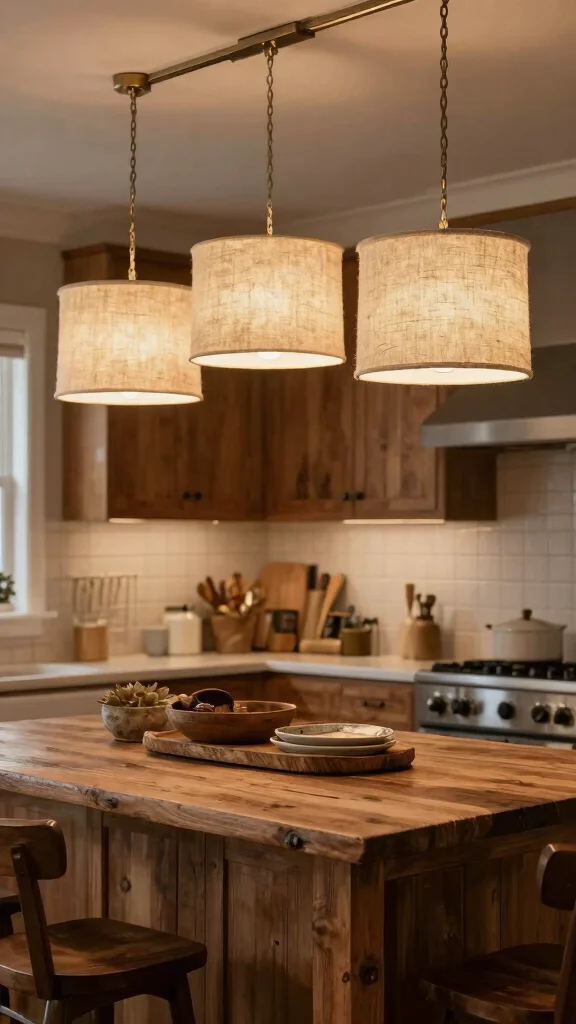 Drum shade light fixtures provide a versatile solution for rustic kitchen island lighting. Their rounded shape creates soft, diffused light that warms up the space beautifully. Opt for shades made of natural fabrics like linen for a cozy feel, or metal for a modern twist.