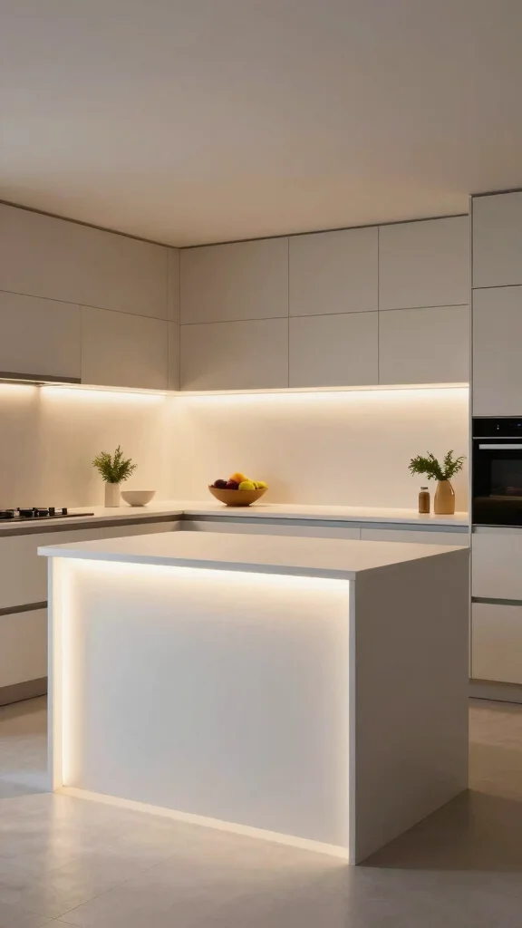 For a sleek, modern touch, consider installing LED strip lighting under your kitchen island. This minimalist lighting solution not only brightens key areas but also enhances the contemporary feel of your kitchen. Energy-efficient and easily customizable, LED strips provide a clean look that won’t clutter your design.