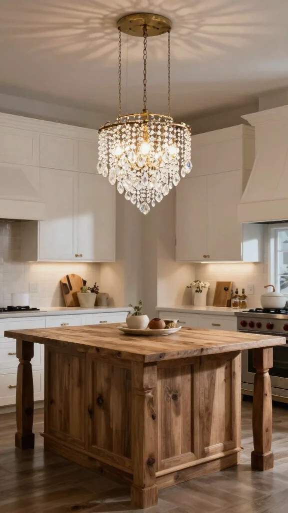 Crystal drop lights can enhance the elegance of your kitchen without overshadowing its rustic charm.