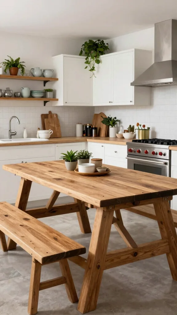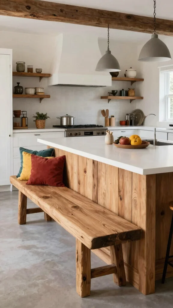 Adding a bench not only enhances flexibility for hosting but also allows you to mix different wood types for an interesting visual contrast. This blend ensures a cohesive yet dynamic look that complements your kitchen style.