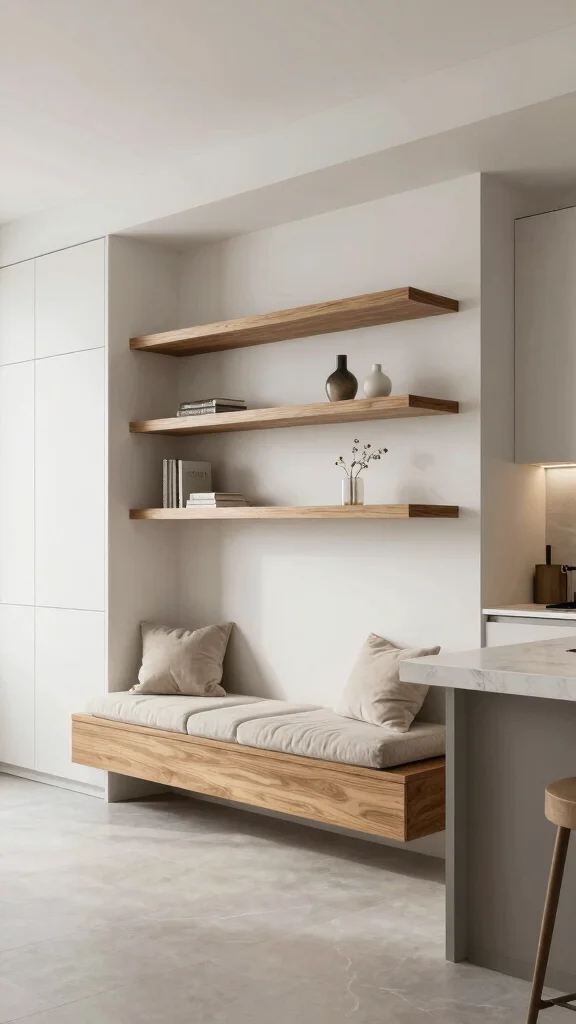 Floating shelf seating offers a unique and modern twist on traditional kitchen arrangements. This design allows shelves to double as seating, creating an ultra-modern and minimalist look ideal for small kitchens. Shelves can be installed against the island or nearby walls, providing casual perches for quick meals or coffee breaks.