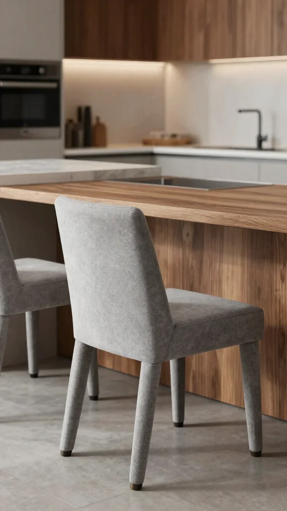 For comfort on a modern kitchen island, match height to the counter and choose supportive forms.