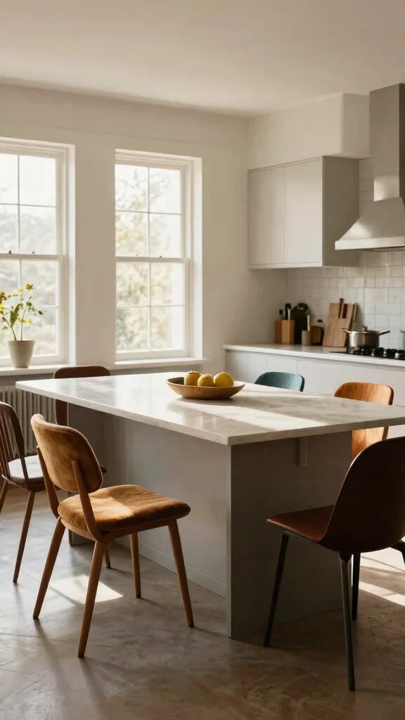Colorful acrylic chairs introduce a playful, vibrant element to your kitchen island. These transparent seats can enhance the illusion of space while adding lively hues that complement your decor without overpowering it. Opt for chairs in bright colors or soft pastels to create a fun yet stylish atmosphere.