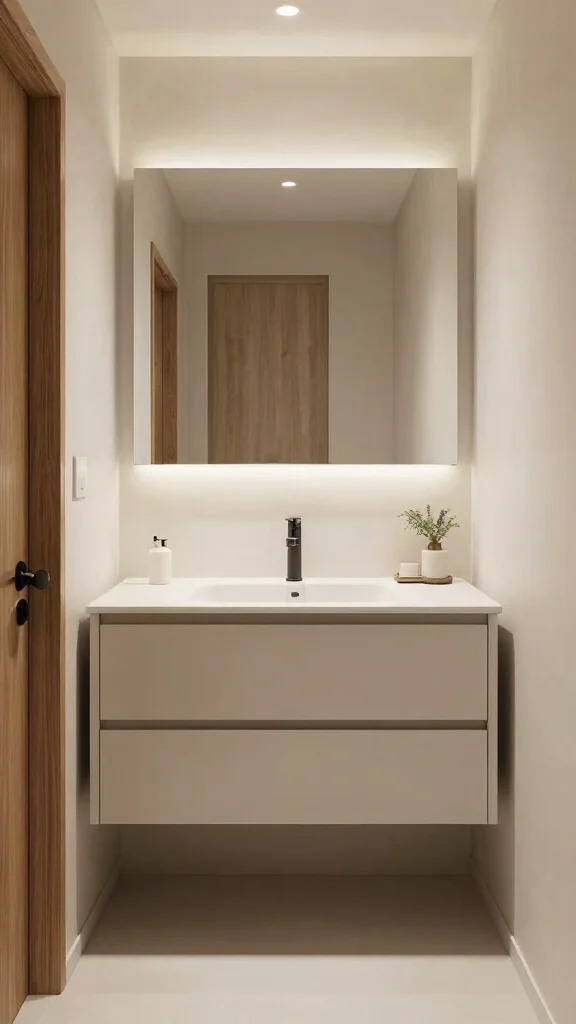 The space beneath the vanity can be utilized for stylish baskets or left open to enhance the feeling of airiness. This design not only increases storage but also aligns with current minimalist trends that favor simplicity and elegance.