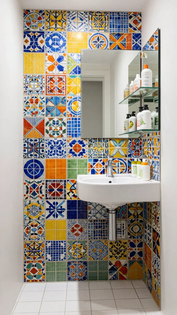 For a stunning focal point, consider creating a feature wall behind the mirror with colorful mosaics. They can also be used to add a vibrant border around the shower or bathtub, creating a playful yet polished look.