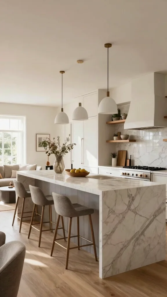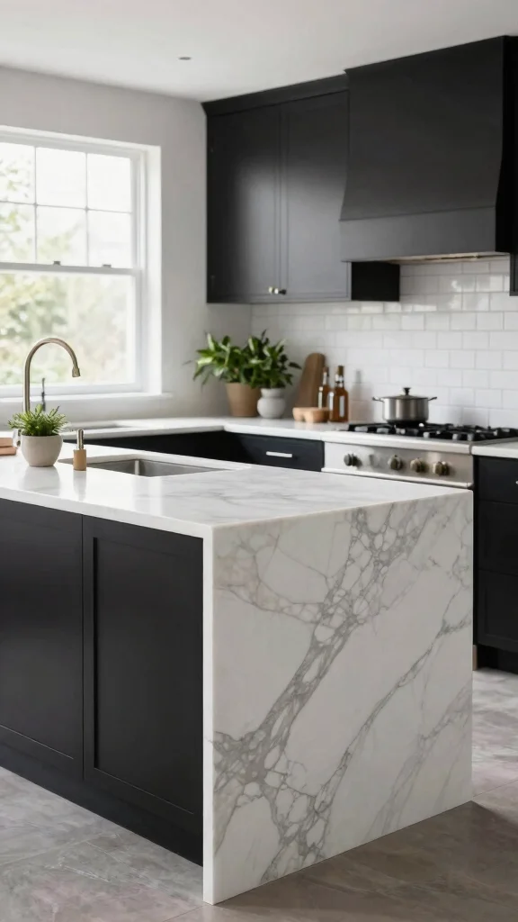 Consider pairing a pristine white marble waterfall island with bold black cabinetry for a stunning contrast that draws the eye.