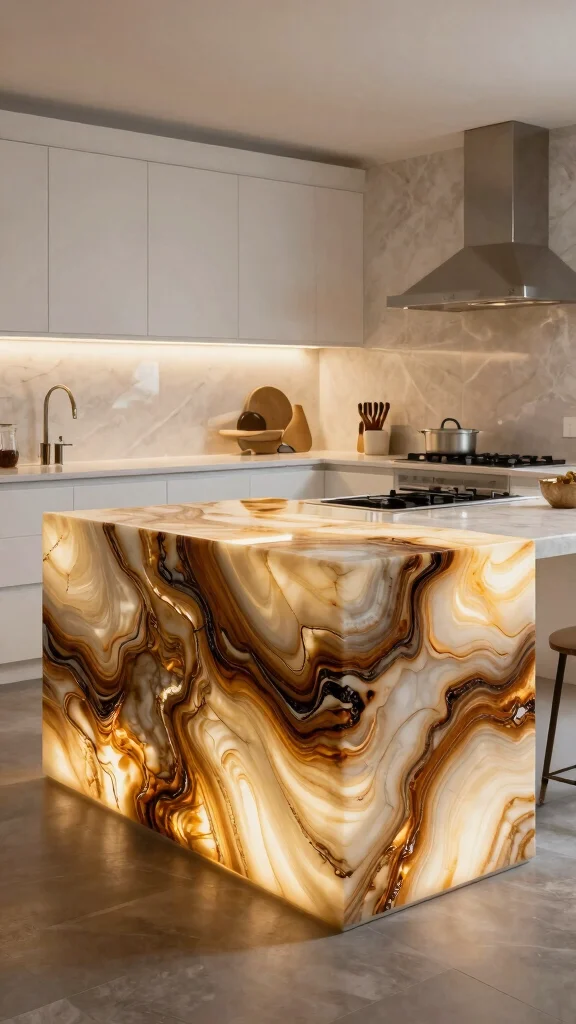 Onyx is a stunning choice for a waterfall countertop, celebrated for its bold patterns and colors.