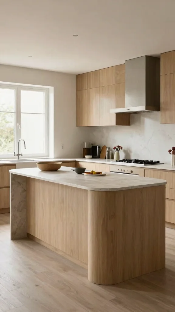 For minimalist vibes, pick materials with a calm, uniform look. Quartz, solid surface (like Corian), or honed granite offer seamless edges and low maintenance. Prefer matte or satin finishes to minimize reflections. Ensure the edge is straight and crisp to emphasize the waterfall effect. Match or subtly contrast the island with cabinetry for a cohesive feel. Don’t forget edge details like a full-depth waterfall on all four sides for maximum impact. This supports waterfall countertop styles, modern kitchen islands, and kitchen design trends.