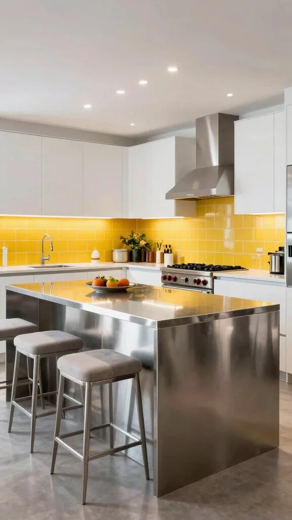 Visualize a kitchen where the stainless steel island serves as a vibrant workspace, reflecting light and energy.