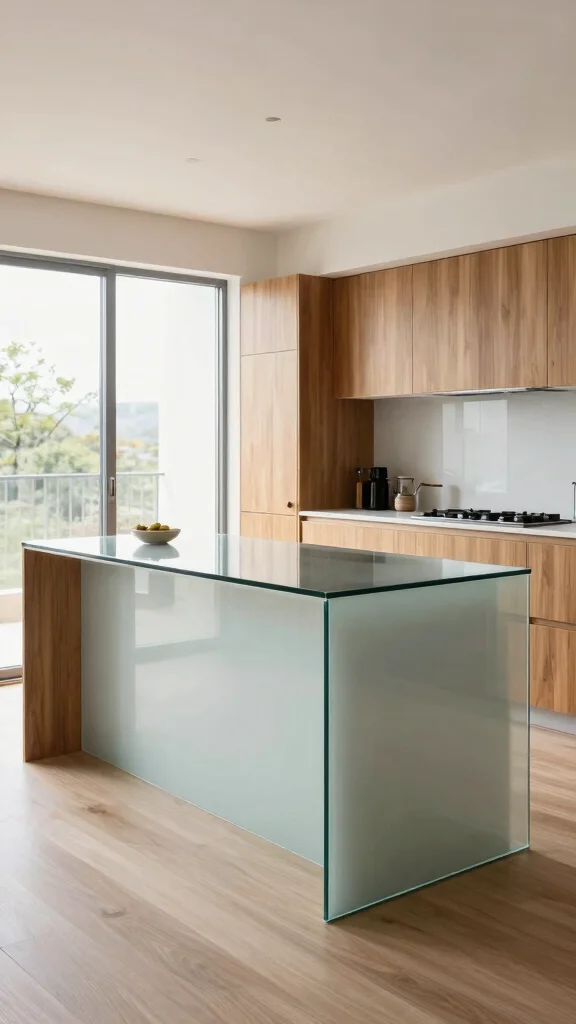 Incorporating glass into your waterfall island design adds a unique and airy feel.