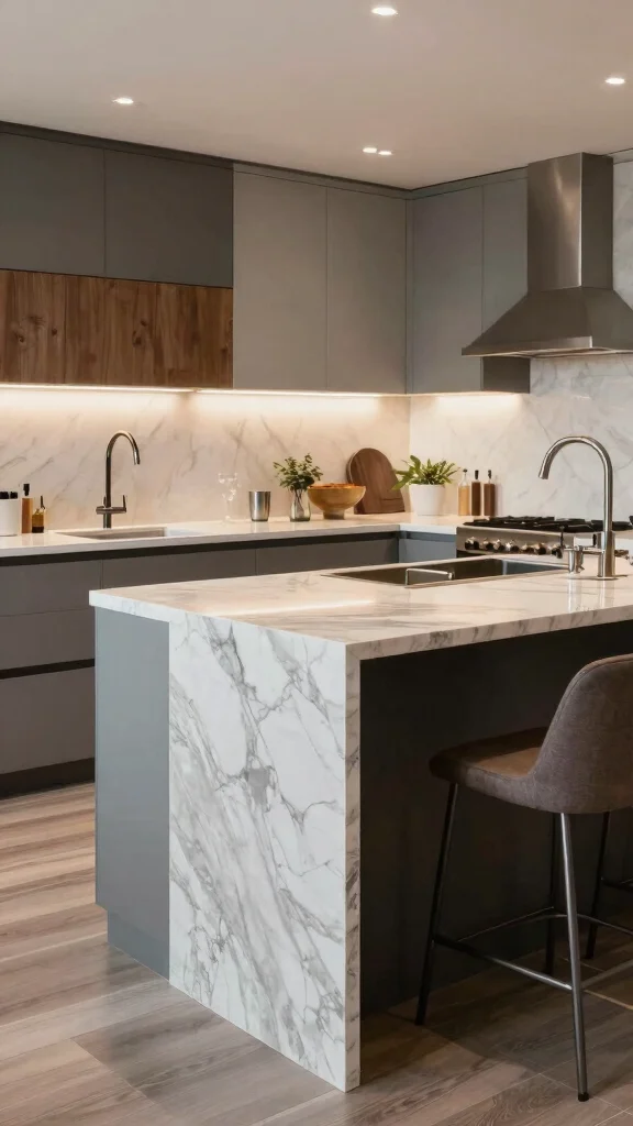 Marble stands out as a classic choice for waterfall countertops, bringing a sense of luxury to your kitchen.