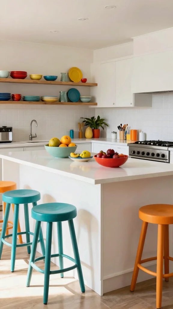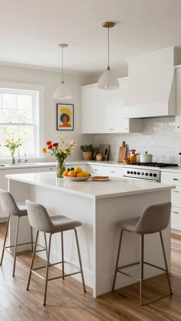 Incorporating bright color accents into your white kitchen island design can elevate the space dramatically. Introduce bold hues through bar stools, kitchenware, or decorative items like vibrant vases filled with seasonal flowers. Colors like teal, coral, or sunny yellow pop beautifully against the crisp white island, creating an inviting atmosphere.For a budget-friendly approach, focus on functional items that serve dual purposes, such as colorful dishware. This allows for easy updates without major changes to your decor.Color Accent Tips:– Choose one or two colors for a cohesive look.