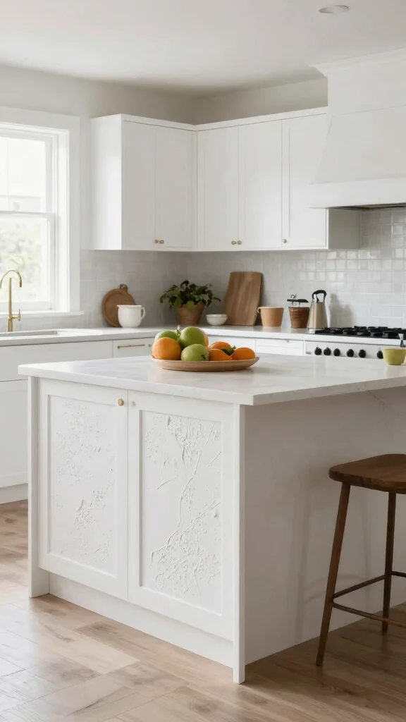 Incorporating textured white finishes on your kitchen island adds depth and visual interest to a bright kitchen. Think about using materials like textured paint or limestone that contrast beautifully with smooth surfaces. Textures enhance aesthetics and can offer functional benefits, such as non-slip surfaces.For practical implementation, consider DIY projects that allow you to experiment with various textures. This can keep costs low while adding a unique touch to your island.Texture Ideas:– Apply textured paint for a distinctive surface.
