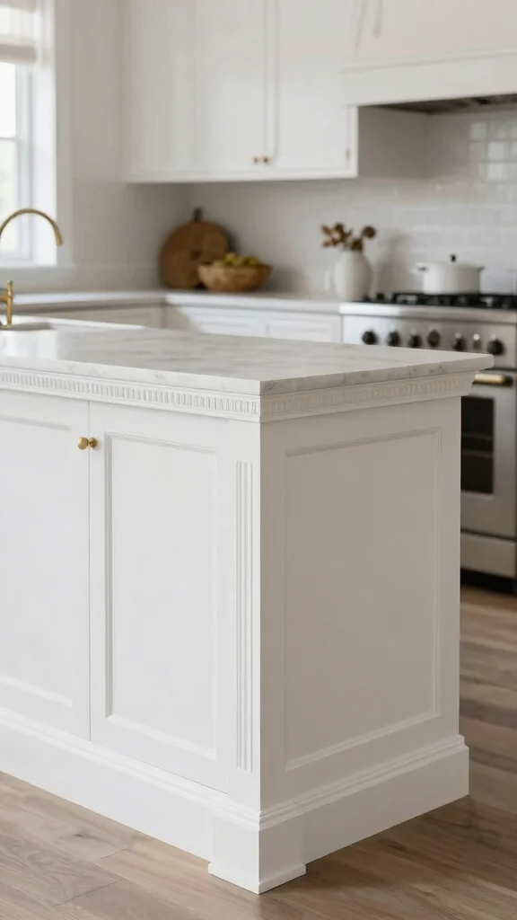 Adding decorative trim and molding to your white kitchen island can significantly elevate its design. Elements like crown molding, beadboard, or decorative brackets add visual interest and sophistication, making the island a standout feature. This approach beautifully merges traditional and modern styles while enhancing elegance in your kitchen.For practical tips, select trims that either match or contrast your cabinetry for a cohesive look. You can also paint or stain the trim to highlight other design elements in the kitchen.Design Tips:– Choose moldings that harmonize with your cabinetry.