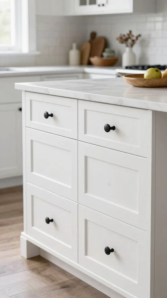 Stylish hardware adds the perfect finishing touch to your white kitchen island, making it uniquely yours.
