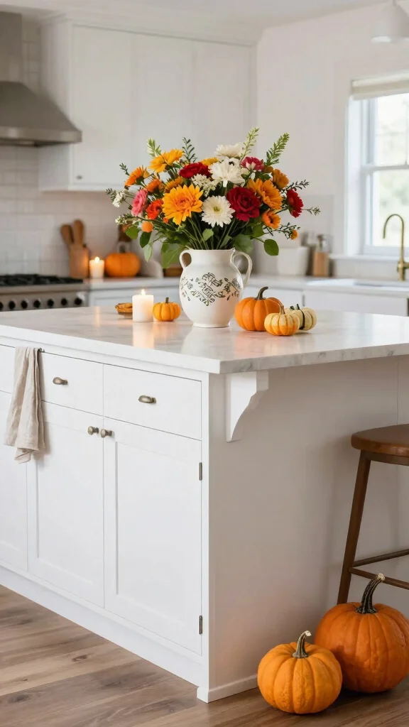 Breathe life into your white kitchen island with seasonal decor updates that keep your space fresh and inviting throughout the year. Change centerpieces with the seasons—think pumpkins in fall, bright flowers in spring, or cozy candles in winter. This allows for creative expression and a way to adapt your kitchen aesthetic with minimal effort.Consider using seasonal kitchen linens or decorative trays that complement your decor while remaining practical. This approach makes it easy to refresh your space without extensive redecorating.Seasonal Decor Ideas:– Use natural elements like branches or pinecones in fall.