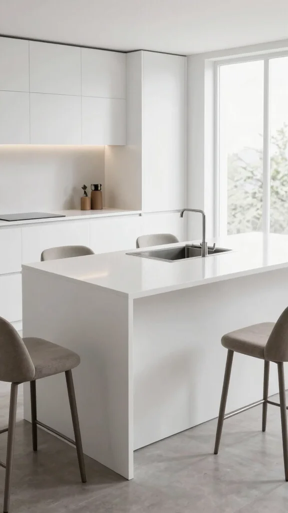 A sleek white kitchen island epitomizes modern design with its clean lines and minimalist aesthetics. This approach works wonders by promoting functionality alongside simplicity, making your kitchen feel airy and expansive. Imagine a glossy white finish with sharp edges that seamlessly integrates with hidden storage and appliances, creating a clutter-free environment. Incorporating smart technology can elevate this space, merging cooking and entertaining effortlessly.For practical implementation, consider investing in multi-functional appliances that blend into the design. You can also explore budget-friendly options such as open shelving for style without breaking the bank.Features to Consider:– Integrate sinks and stovetops for a seamless look.