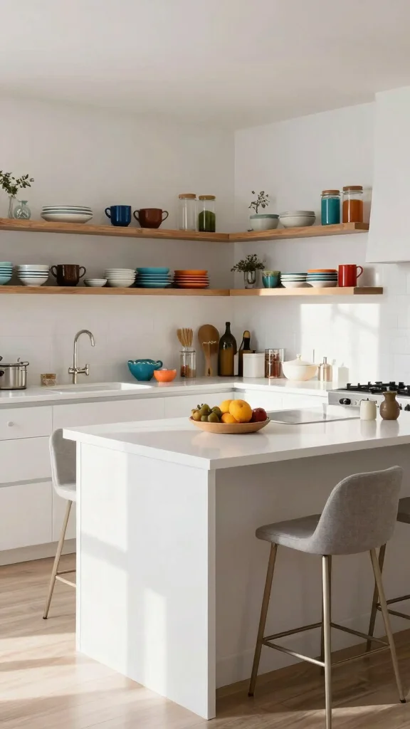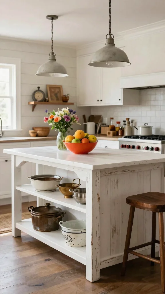 Incorporating open shelving alongside your white kitchen island creates an airy feel while showcasing your favorite kitchen items. Open shelves are functional and serve as a decorative element, allowing for easy access to chic dishware and vibrant cookbooks. This setup turns everyday items into part of your kitchen decor, adding personalization and creativity.To implement this, consider DIY shelving using reclaimed wood or budget-friendly materials that match your island. This can enhance both aesthetics and practicality.Benefits of Open Shelving:– Encourages organization and easy access to items.