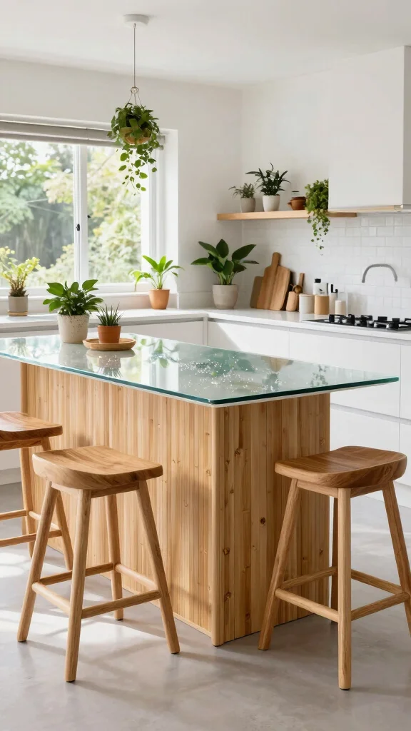 Consider bamboo or FSC-certified wood for the island base, quartz countertops with recycled content, and recycled-glass surfaces.